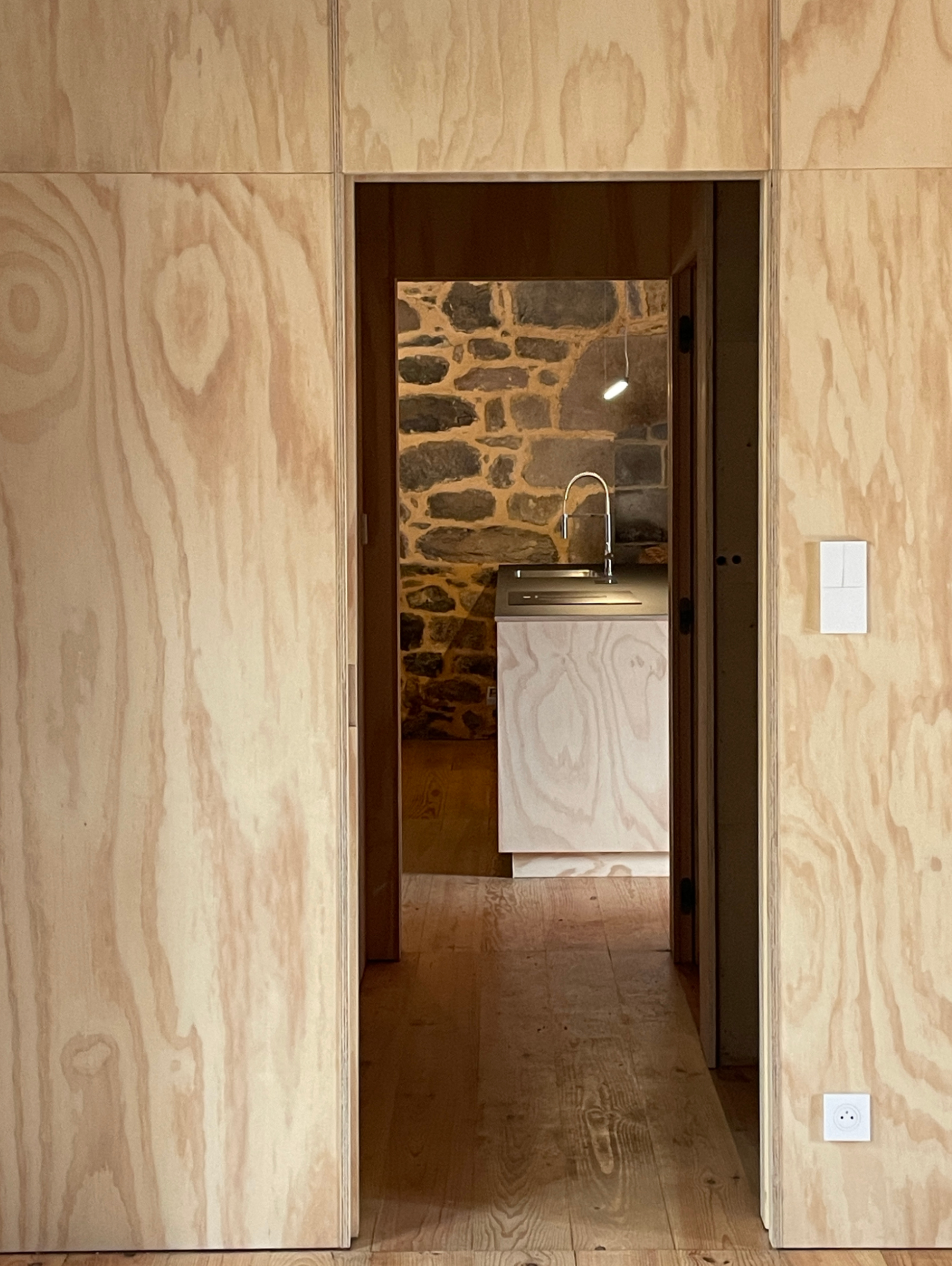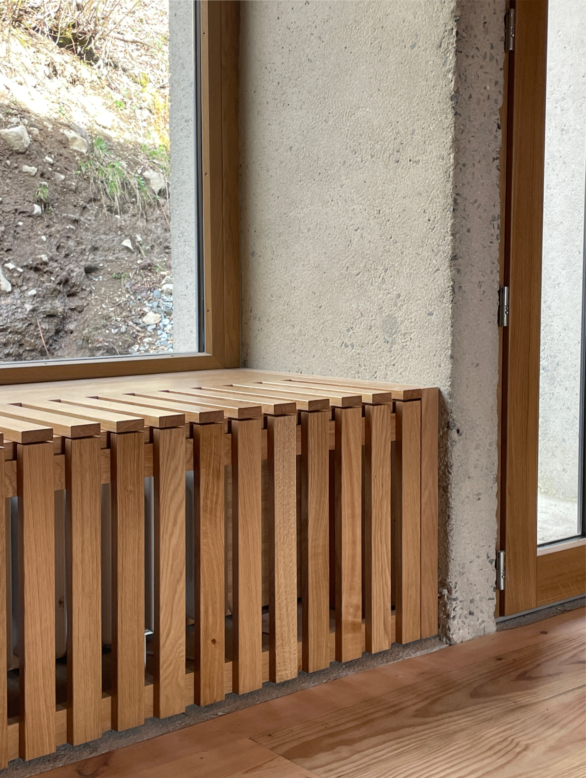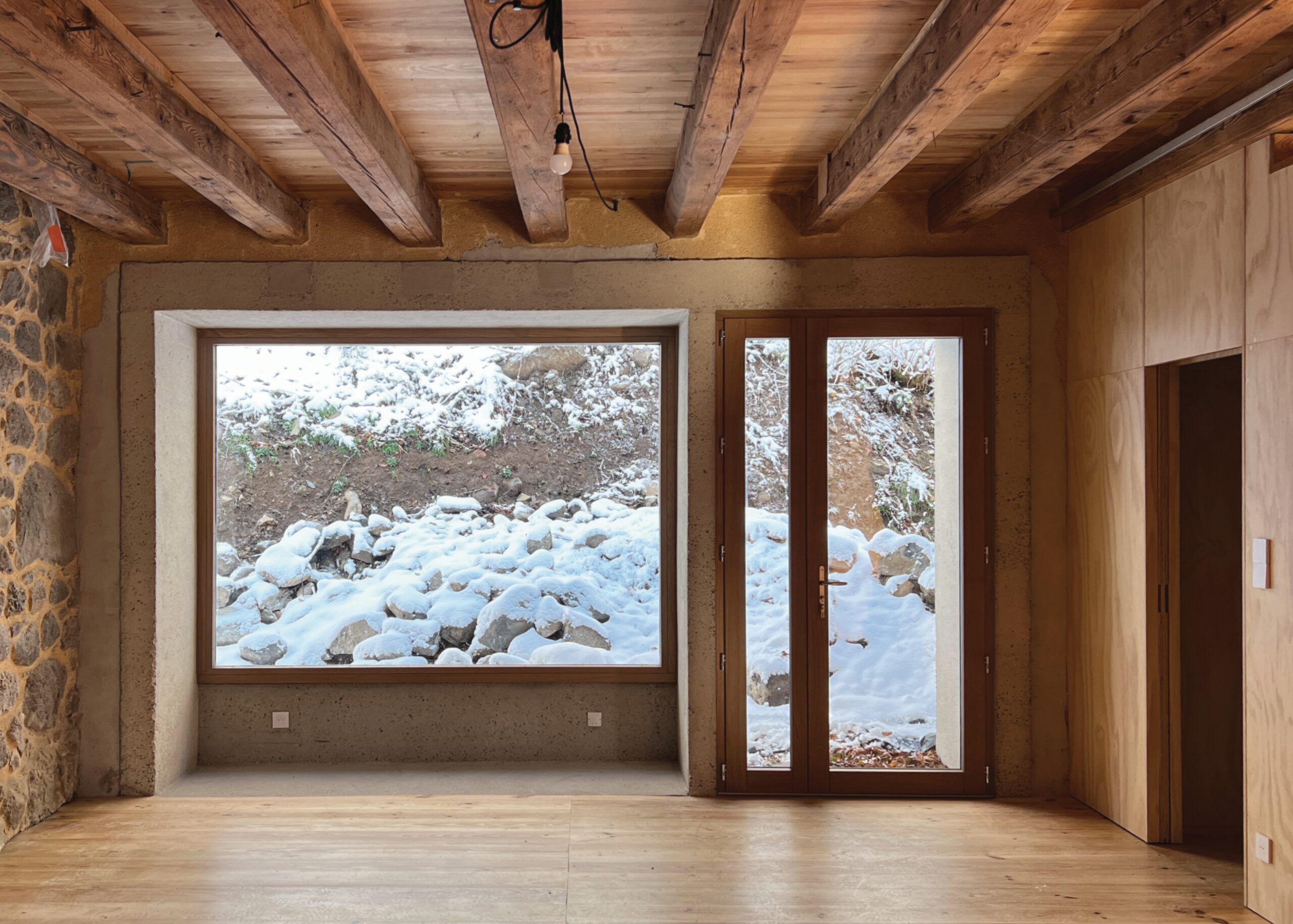 L’ouverture accueille également une assise intégrée, conçue comme un espace de pause et de contemplation, invitant à profiter du paysage et de la lumière.