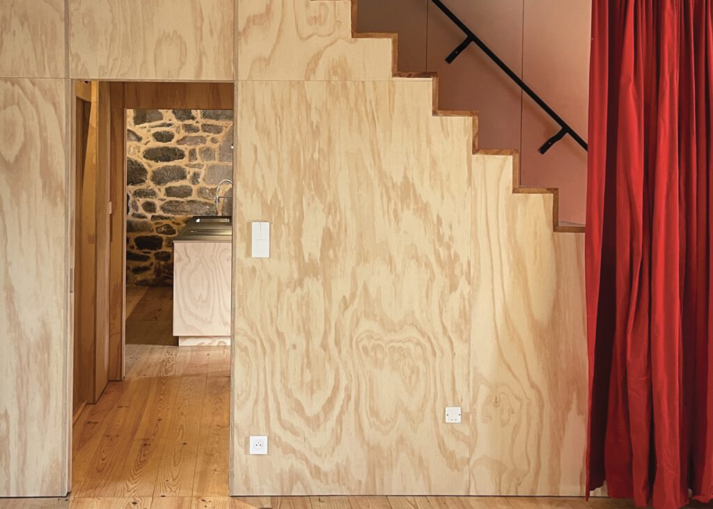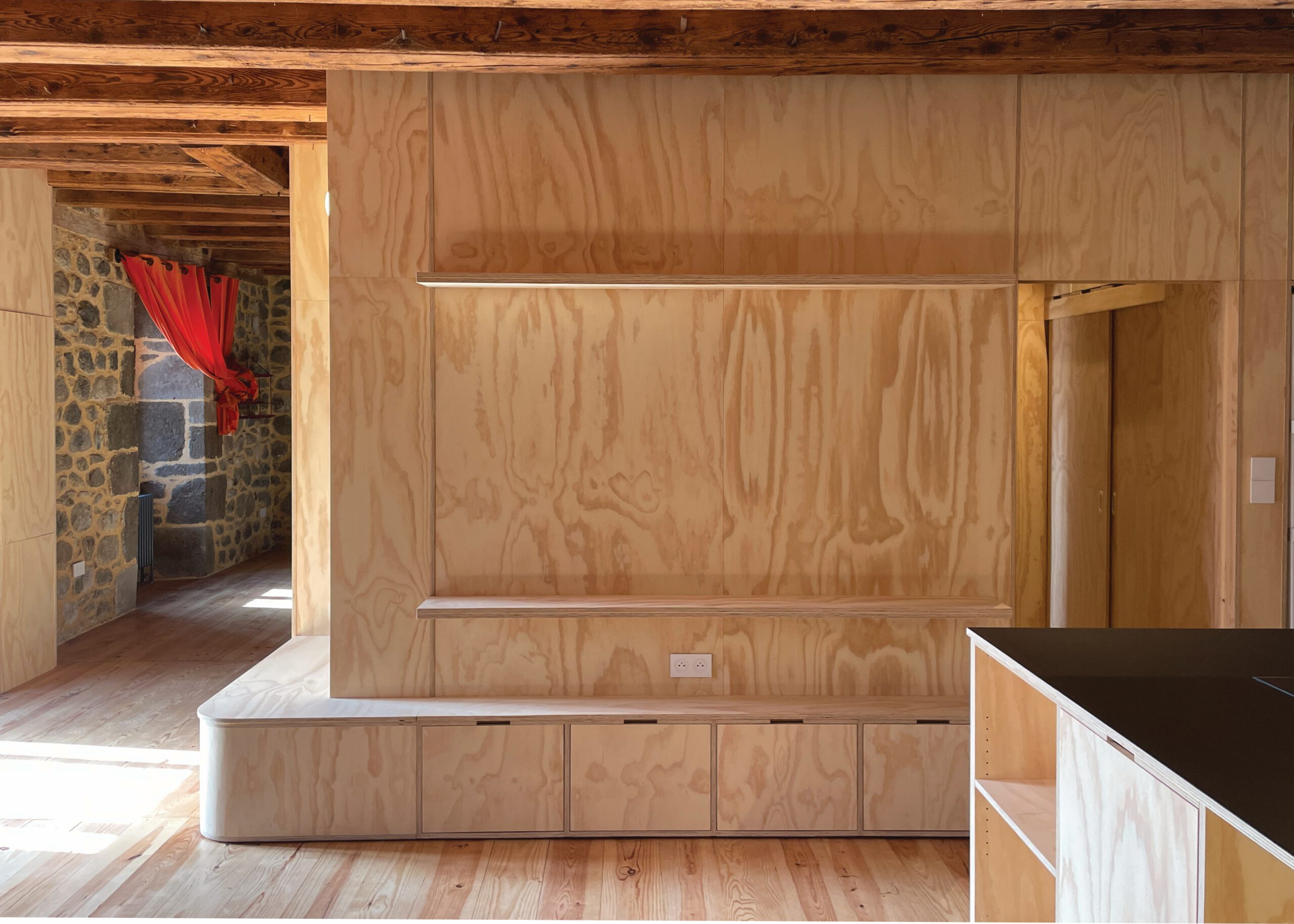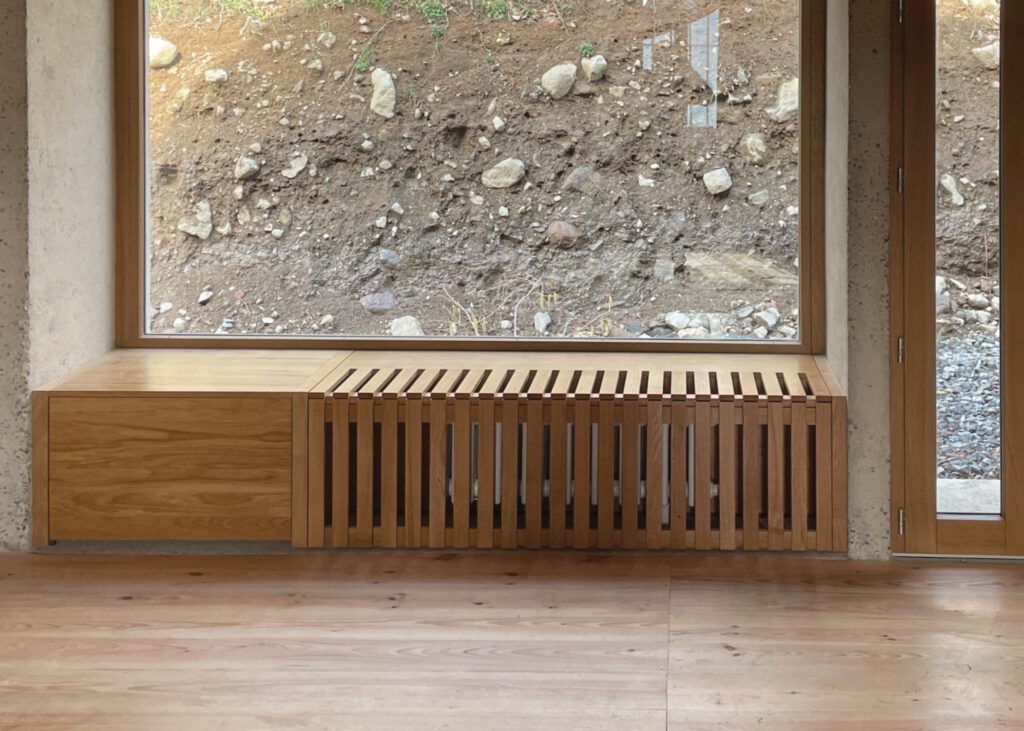 L’ouverture accueille également une assise intégrée, conçue comme un espace de pause et de contemplation, invitant à profiter du paysage et de la lumière.